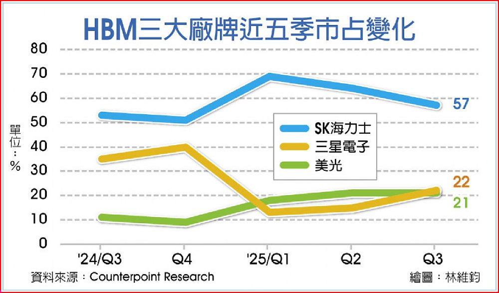 AI晶片及HBM的熱絡需求不僅推動HBM3E漲價,也讓三星鹹魚大翻身。市調機構Counterpoint Research指出,三星今年第三季全球HBM營收市占達22%,重返第二名,僅次於SK海力士的57%,並領先美光的21%。