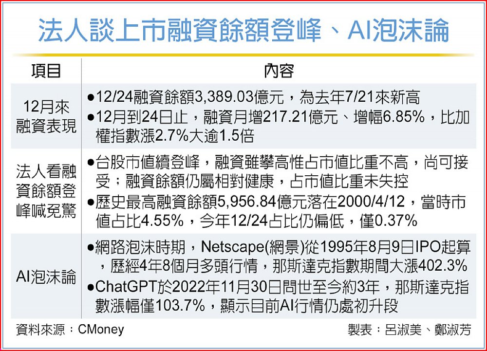 美股道瓊及標普500指數24日齊登高,26日台股加權指數乘勝追擊,創高可期。然有融資餘額升溫過熱與AI是否泡沫,成為市場關注兩大焦點;對此,多位法人拿出數據印證,目前市場仍屬健康擴張,距離失控或泡沫破裂尚有一段距離,並直言「投資人應該勇於進入泡沫、享受泡沫」,AI只是初升段,未來還有主升段的暴漲行情可期。