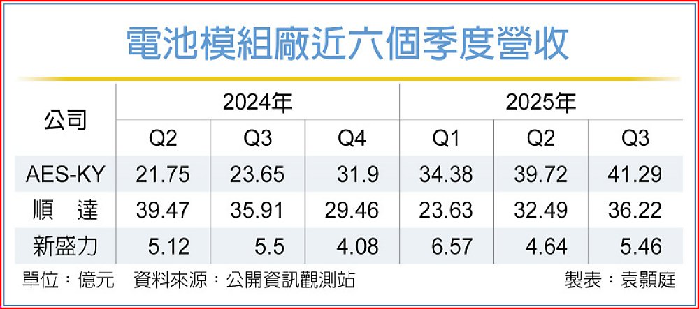 AI資料中心擴建熱,除了輝達之外,CSP大廠自行設計的ASIC機櫃也擴大採用BBU(電池備援電力模組),市調機構預估AI伺服器BBU在2026年成長率高達50%。AES-KY、順達、新盛力等BBU三雄明年大擴產迎商機,新產能拚翻倍。