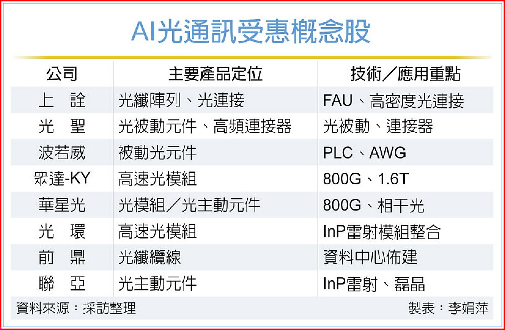 在AI驅動下,台灣光通訊廠商也正逐步從傳統電信與一般資料中心應用,轉向更高規格的AI互連市場。例如,上詮積極布局光纖陣列(FAU)與高速光連接解決方案,切入AI叢集高密度連接需求;光聖在光被動元件與高頻連接器領域,受惠於資料中心頻寬升級與規格演化。