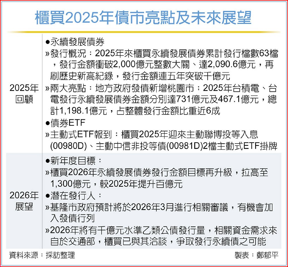 櫃買中心2025年股債雙引擎持續發力,債券市場表現尤為亮眼,永續發展債券與主動式債券ETF為今年兩大業務亮點,不僅永續發展債券累計發行金額一舉突破2,000億元、改寫歷史新高,主動式債券ETF亦首度登場,台灣債券ETF今年喜迎主動聯博投等入息(00980D)、主動中信非投等債(00981D)2檔主動式債券ETF。