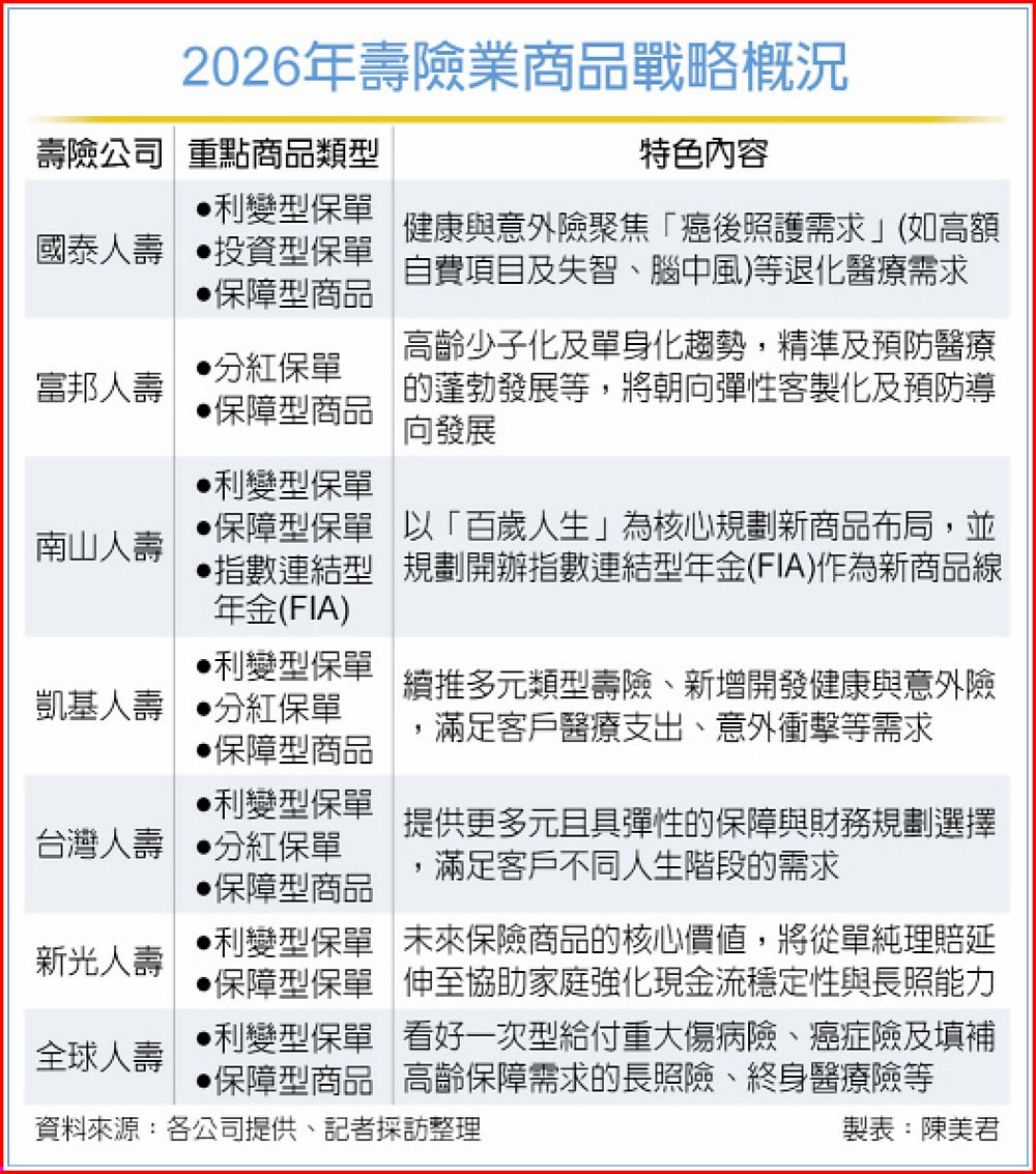 國泰人壽精準鎖定「癌後照護」與「退化性疾病(如失智、腦中風)」兩大面向,持續開發可滿足專屬客群需求的差異化商品;國壽明年將持續強化利變型商品的保障訴求,透過提高身故保障倍數並增加多元保障的差異化商品設計,例如:添加豁免機制、多樣化健康給付或創新還本機制等,滿足資產傳承與保障自用多重需求。