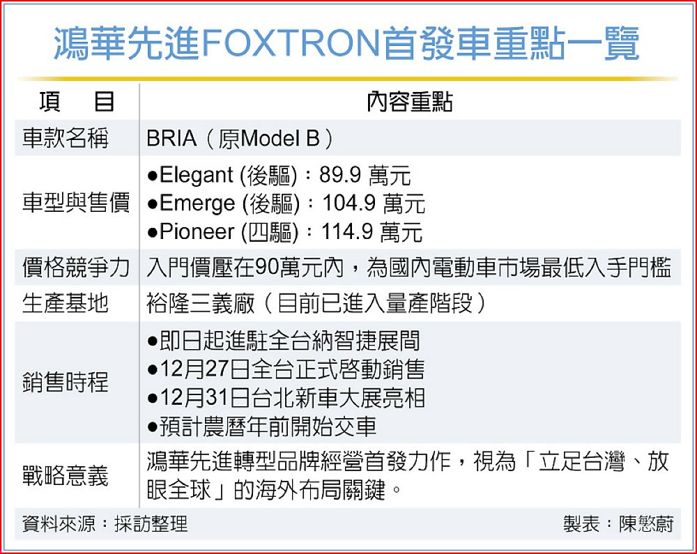 鴻華先進表示,即日起進駐全台納智捷展示中心,27日全面啟動銷售,也將於31日開展的台北新車大展中亮相。據悉,BRIA已於裕隆三義廠進入量產階段,確保上市初期供應無虞,全力備戰明年農曆年前交車。