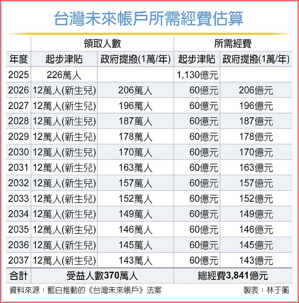 藍白25日共同宣布將推動《台灣未來帳戶》法案。法案明定由政府在12歲以下孩童帳戶存入新台幣5萬元,每年再提撥1萬元,基金初始規模1,130億元,人數約226萬人。依據試算若家長未額外提撥,18歲成年後可領回33.9萬元,可用於高等教育、創業或技能投資與首次購屋自備款。