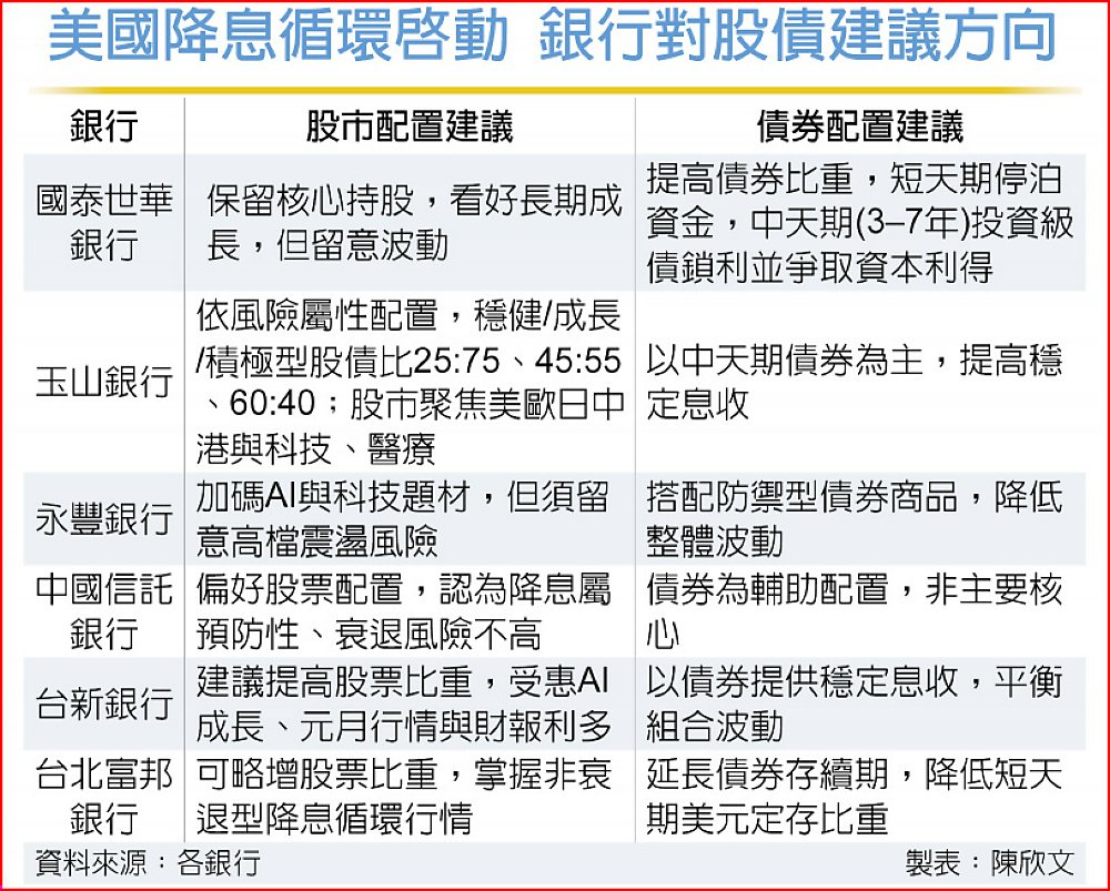 台北富邦銀行則指出,歷史經驗顯示,在非衰退型降息循環中,股市於降息後12個月平均仍有逾一成正報酬,配置上可略為增加股票比重、延長債券存續期,並降低短天期美元定存比重,但仍應保留足夠現金水位,以因應景氣不確定性。