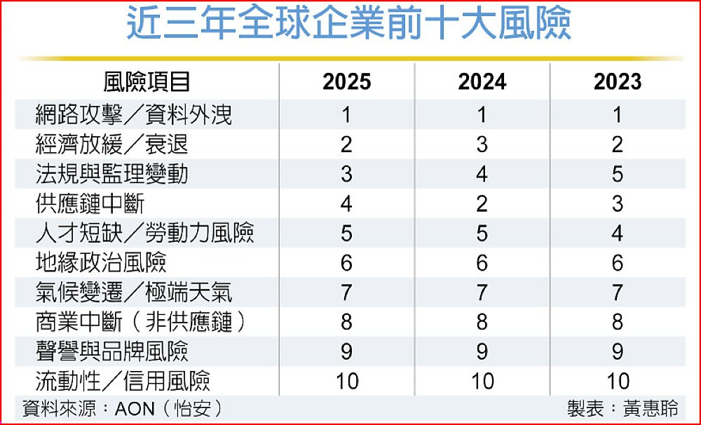 隨著全球經濟環境高度不確定、科技快速演進與地緣政治風險持續升高,企業面臨的風險樣態正出現結構性轉變。根據Aon(怡安)發布的「2025 全球風險管理調查(Global Risk Management Survey)」,全球企業關注的「十大風險」排序較2023、2024年明顯洗牌,但資安風險連三年居首。