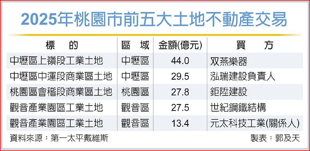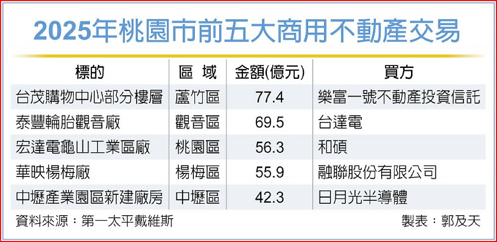 回顧2025年桃園商用不動產大型交易中,除樂富一號不動產投資信託以77.4億元買下台茂購物中心部分樓層外,不少大型交易均為工業交易,如台達電以69.5億元買下泰豐輪胎觀音廠、和碩以56.3億元買下宏達電龜山工業區廠房、融聯以55.9億元買下華映陽梅廠等,其餘如日月光以及傳統產業双燕樂器也都斥資逾40億元入手工業地產。