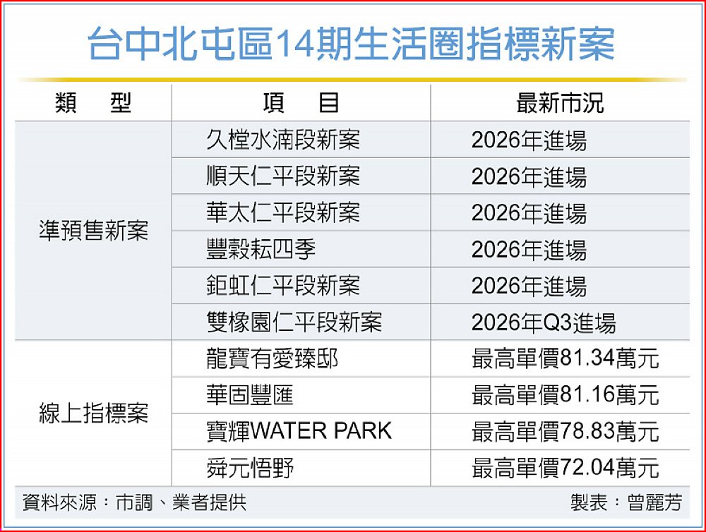 雖然整體房市面臨景氣降溫壓力,北台中在重大建設密集推進帶動下,仍穩居台中推案一線戰區,尤其隨著商場開發、重大建設與高端餐飲等題材發酵,包括雙橡園、順天、鉅虹、亞昕、華太、豐穀等建商,均規劃2026年於北台中的14期重劃區陸續推案,數百億推案量即將傾巢而出。