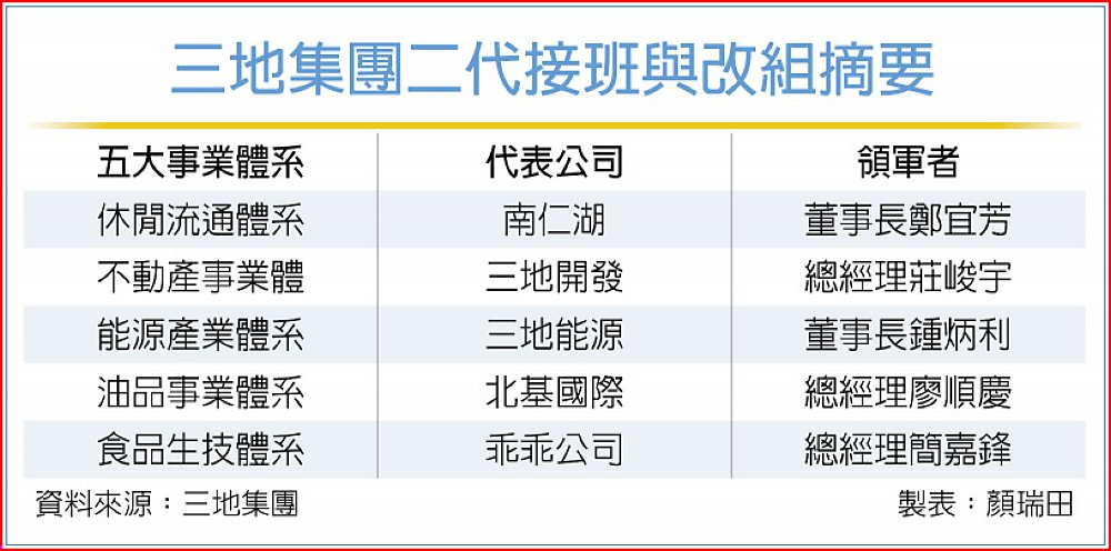鍾育霖指出,為落實上市櫃公司治理標準的決心,三地集團此次同步進行組織架構簡化與專業分工,整合集團資源,將事業版圖劃分為五大核心體系,分別由具備豐富實務經驗的經理人團隊領軍。