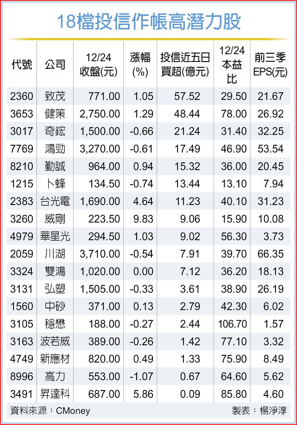 檢視投信基金最新公布的截至11月底前十大持股中,且12月以來、近五日台股反彈期間累計呈現買超,25日休市前夕加碼力道仍不減,但投信持股比例低於15%的個股中,股本小於50億以下的中小型股,總計有18檔,分別為:致茂、健策、奇鋐、鴻勁、勤誠、卜蜂、台光電、威剛、華星光、川湖、雙鴻、弘塑、中砂、穩懋、波若威、新應材、高力及昇達科。