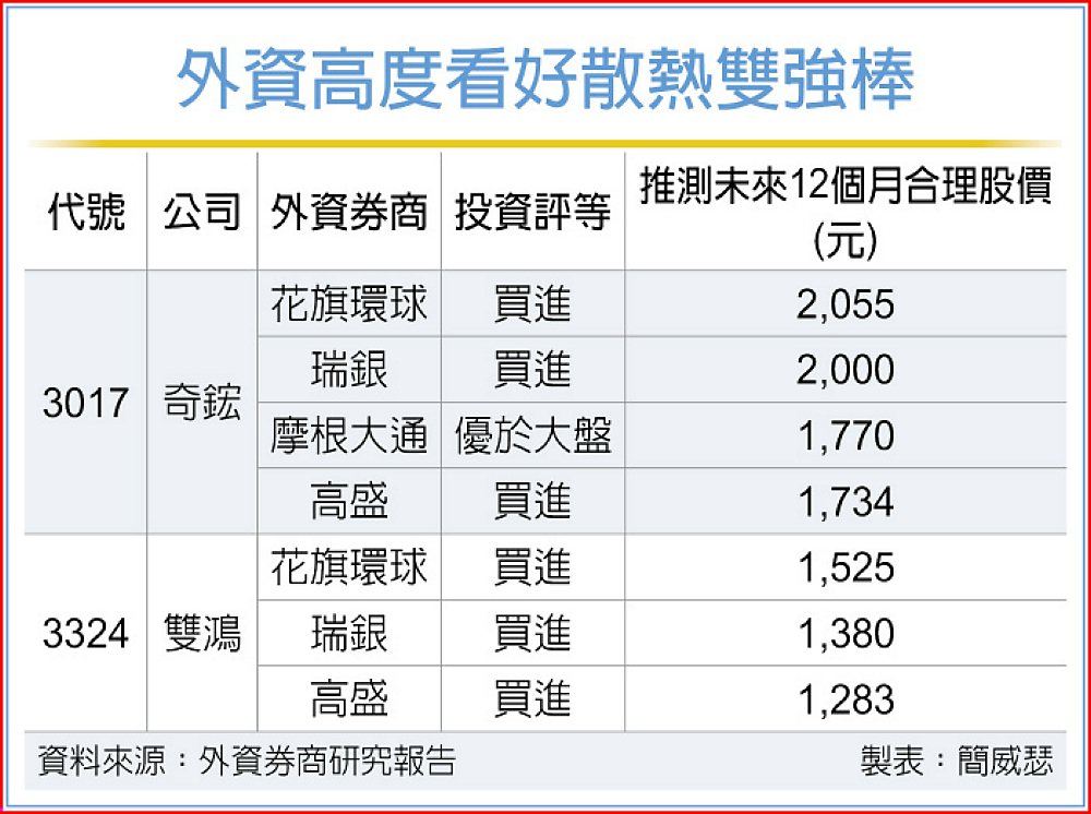 花旗環球證券指出,隨AI伺服器的熱設計功耗(TDP)持續攀升,散熱架構由氣冷加速轉向液冷,擴張散熱於每機櫃中內含價值,台系供應鏈中特別青睞奇鋐(3017)與雙鴻(3324),初評同步給予「買進」投資評等,股價預期各為2,055元、1,525元,潛在上檔空間高達44%與66%,並同步列入「未來90天上漲觀察清單」。