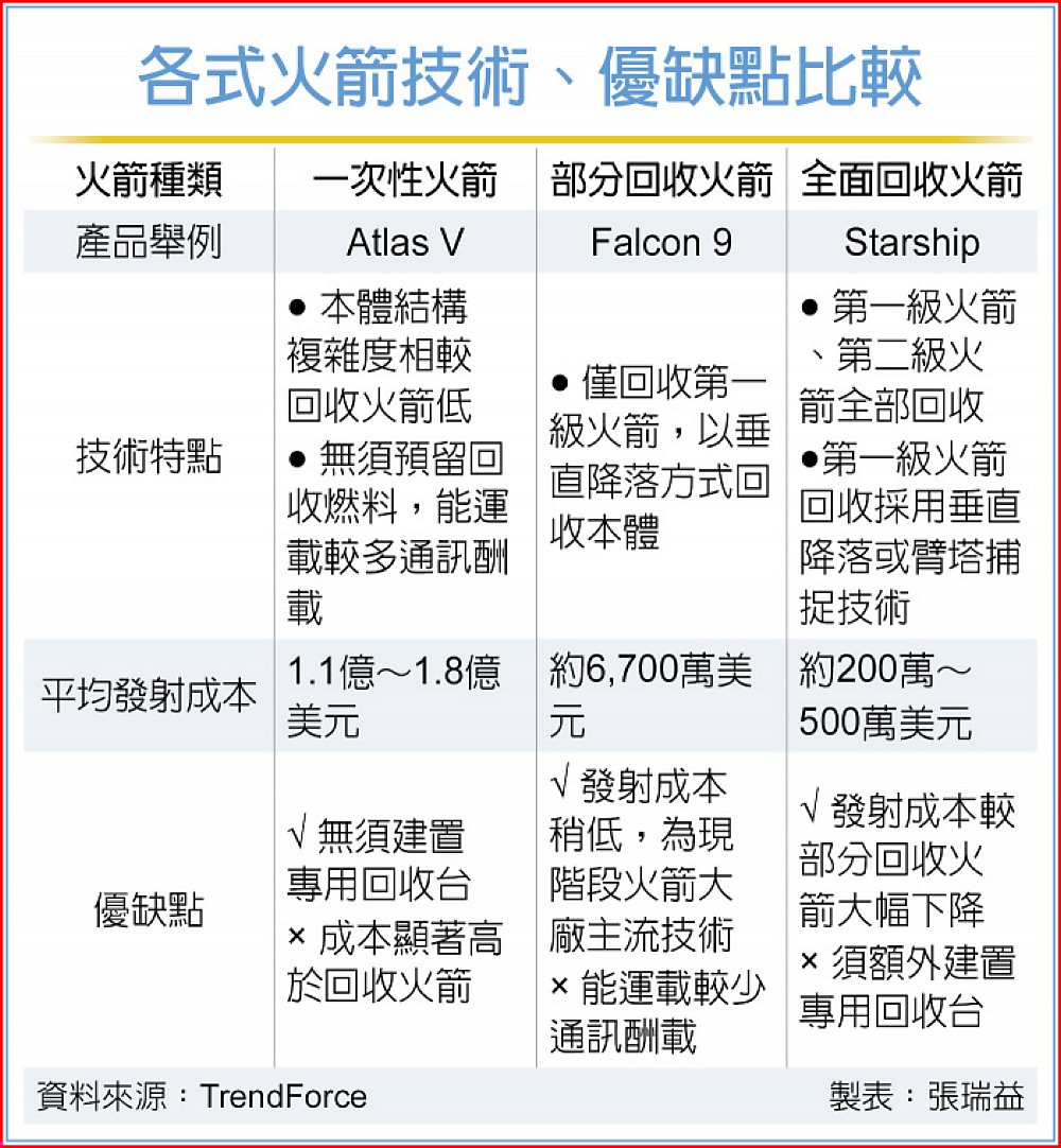 TrendForce表示,目前一次性火箭的平均發射成本落在1.1億至1.8億美元,部分回收則是6,700萬美元左右。全球主要大廠積極發展可回收技術,目標在達成全面回收的情況下,將發射成本降低至200萬至500萬美元。