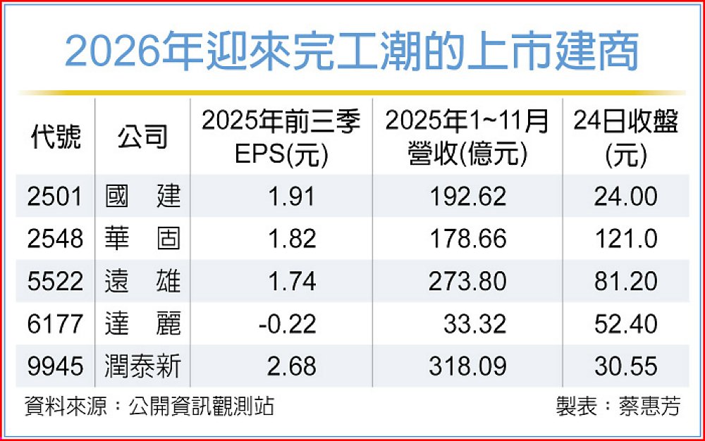 央行第四季理監事會議未再重手打房,新青安核撥金額11月已回升,水龍頭鬆開效應浮現,再加上明年新青安不落日,營建股近一周來築底反彈,類股指數小幅攀升3.3%,部分個股股價蠢蠢欲動。國建(2501)、華固(2548)、遠雄(5522)、達麗(6177)、潤泰新(9945)等建商,2026年更將迎來下波交屋潮題材,完工交屋量可望放大,基本面有撐。