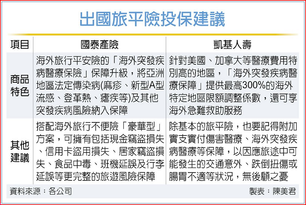 凱基人壽提醒,海外醫療費用普遍高昂,新台幣上萬甚至數十萬的醫療支出並不罕見,除基本旅平險,民眾也要記得附加實支實付傷害醫療、海外突發疾病醫療等保障,以因應旅途中可能發生的交通意外、跌倒扭傷或腸胃不適等狀況。