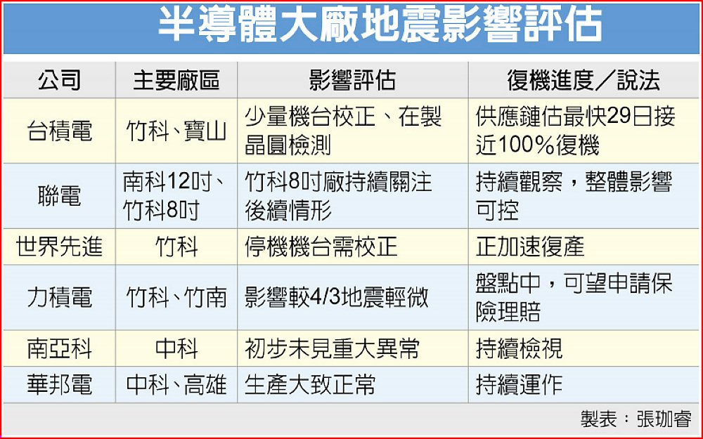 世界先進表示,人員均安,影響仍在評估中;聯電指出,其12吋廠主要位於南科,震度僅二至三級,生產影響有限,竹科8吋廠將持續關注後續情形。