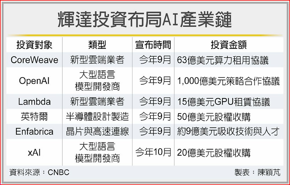 輝達近年在AI產業鏈展開一連串交易與投資,從大型語言模型開發商OpenAI、xAI,到專注AI算力服務的新型雲端業者Lambda、CoreWeave,甚至投資英特爾與Enfabrica,形成橫跨軟硬體與雲端的完整生態系。
