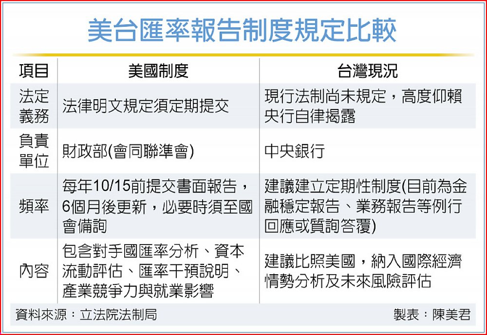 針對近期國際媒體對台灣匯率政策的關注與討論,立法院法制局發表最新研究建議,主張我國應參考美國現行法制,建立常態性的「國際經濟政策報告」制度。法制局指出,透過法律明文規範中央銀行定期向國會提交匯率相關報告,不僅能有效提升政策透明度、強化國會監督職能,更有助於降低市場不必要的臆測風險,穩定金融環境。