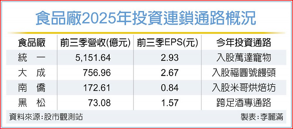 國內老牌食品廠近年積極推動垂直整合,且以龍頭統一企業為標竿,多元布局通路連鎖,建構從原料、製造到銷售一條龍,其中大成除經營餐飲、烘焙通路外,2025年更入股手工饅頭老字號福圓號做為其麵食下游整合平台;南僑除海內外餐飲事業,也宣布入股米哥烘焙坊,完整烘焙一條龍。