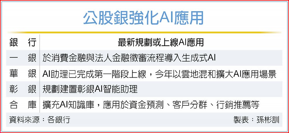 強化AI應用,公股銀行加快速度,鎖定AI智能助理、內部知識庫、AI客服等層面,建置專屬AI助理,強化模型訓練或相關人才培育,深入業務流程與創造營運價值。