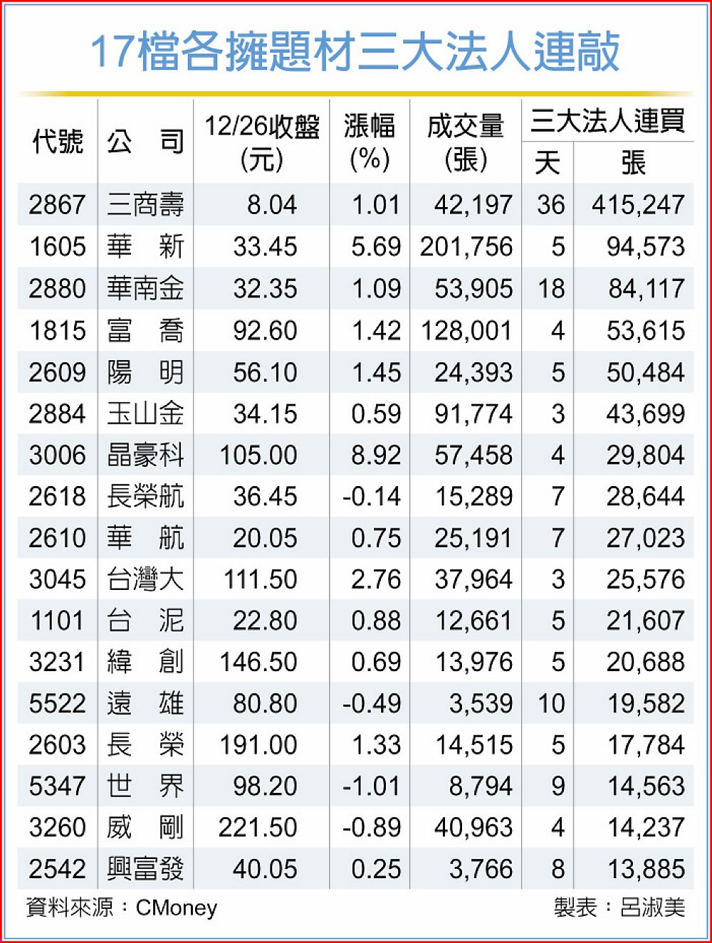 台股上周耶誕周,自營商帶著外資買,推升三大法人轉為買超523億元,台股2025年即將封關迎接新一年,選股布局上,關注三大法人連買股,包括華新(1605)及富喬(1815)等17檔;富喬股價更攻上92.6元歷史新高,而具有併購題材的三商壽(2867)更獲得三大法人連36日狂敲41.52萬張。