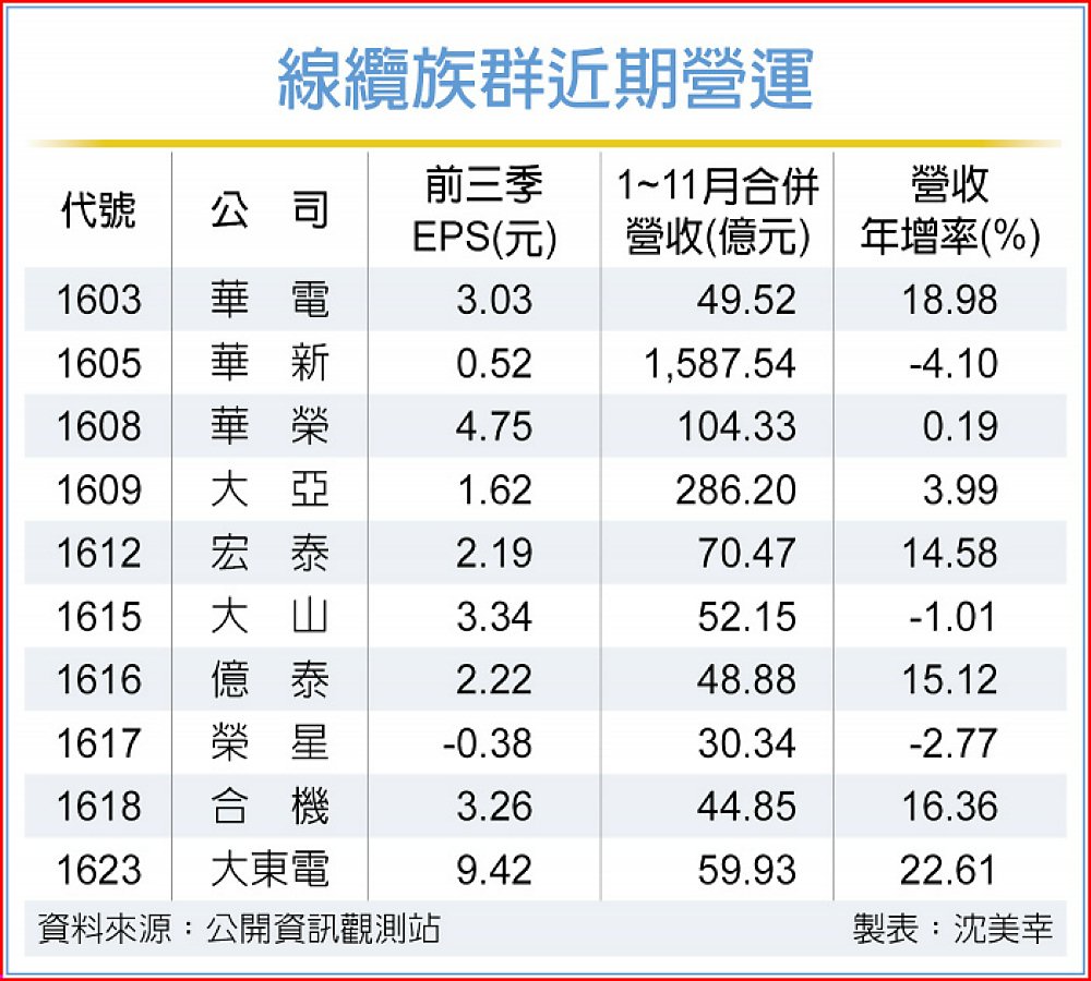 國際銅價大漲題材,點亮線纜業「錢」景,華新(1605)等精煉銅板或銅線供應商,已通知線纜廠調漲2026年加工費,短期線纜業報價全面看漲。多數線纜業者手握台電強韌電網計畫訂單,在手訂單50億元起跳,華榮(1608)、大亞(1609)、大東電(1623)訂單更達百億元以上,2026年營運動能無虞。