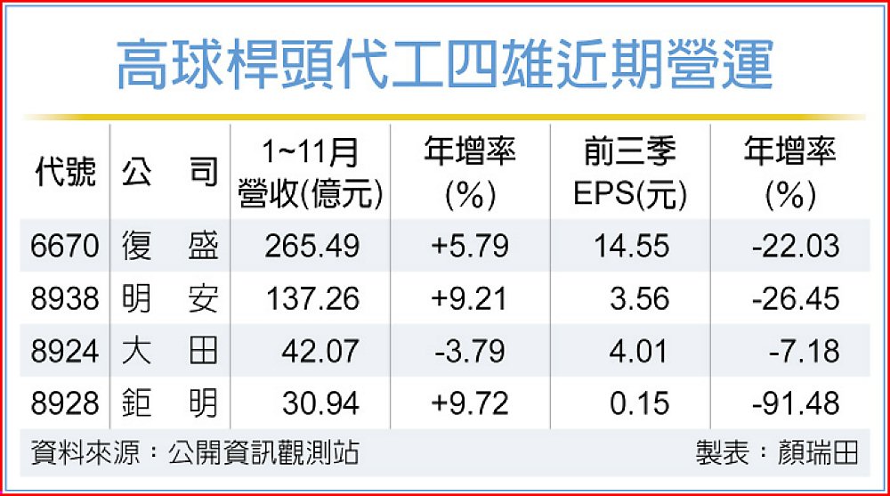 2025年即將翻篇,高球桿頭代工四雄營運有「一確定,一風險」,在第四季的旺季加持下,2025年營收將繳出好成績,其中復盛(6670)、明安(8938)、鉅明(8928)將勝2024年,因「關稅訂單遞延」而落後的大田(8924),至少也將追平2024年。