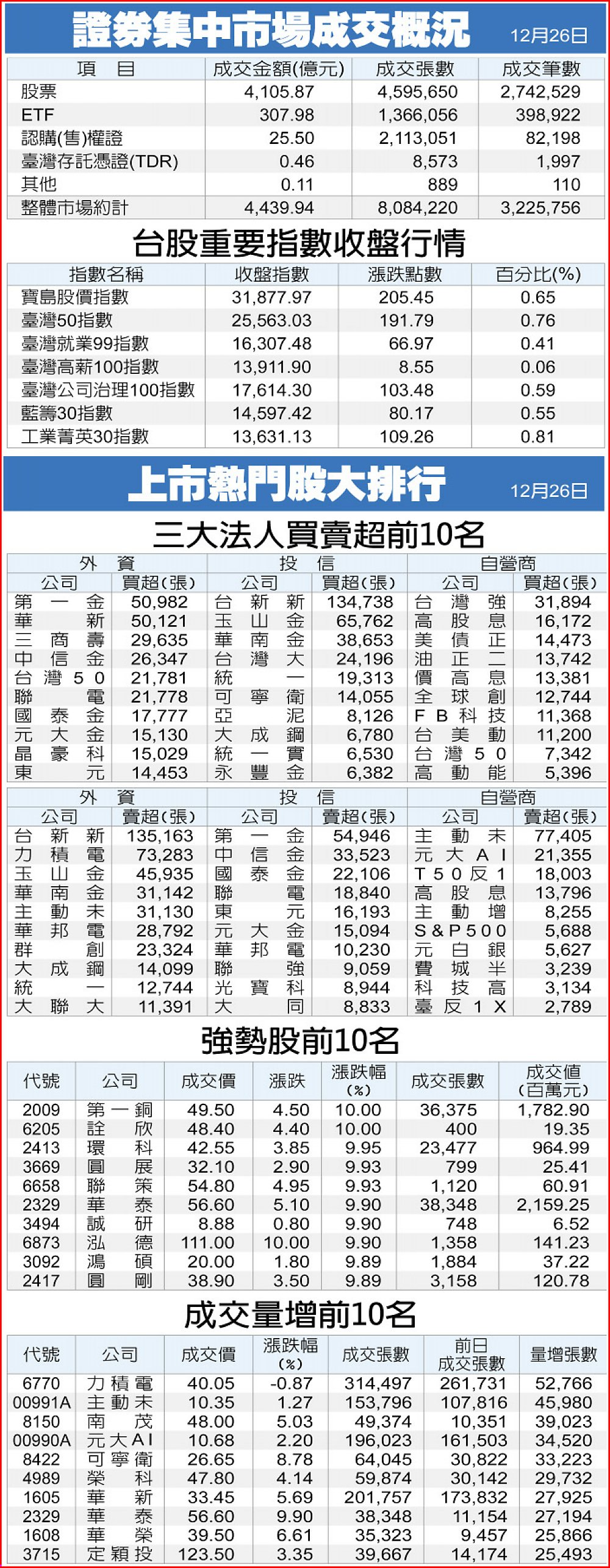 證券集中市場成交概況、上市熱門股大排行