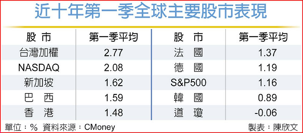 迎接2026年至來,統計過去十年全球主要股市在第一季度的平均表現,整體來看漲跌各半,以前十強股市來看,幾乎都繳出正報酬,表現依序為台灣2.77%、美國NASDAQ2.08%、新加坡1.62%、巴西1.59%、香港1.48%等,整體來看成熟股市與新興股市各有表現。投信法人看好台股元月行情,因新基金掀起募集熱潮,6檔確定1月開募,就有3檔是台股ETF,包括兩檔主動式與一檔被動式。
