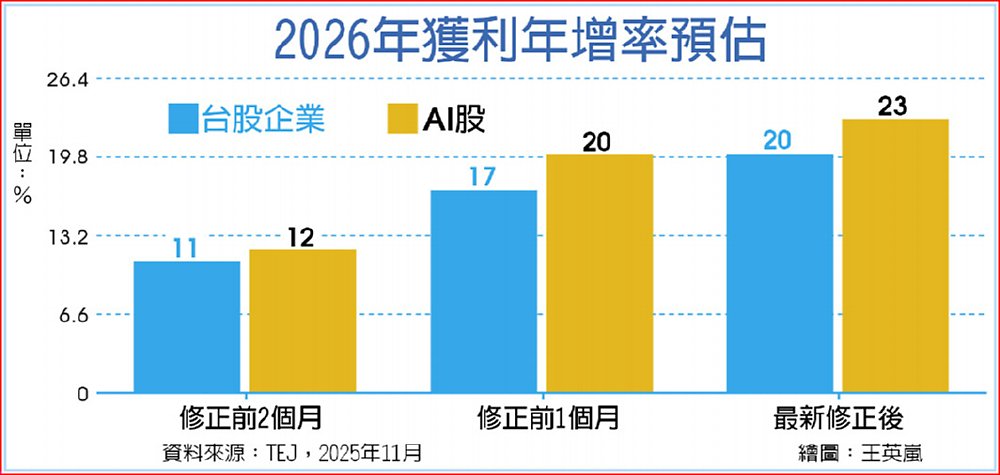 台新臺灣優勢成長主動式ETF基金(00987A)經理人魏永祥指出,若美國後續通膨數據溫和,預期2026年仍有望再降息,營造豐沛的資金行情;此外,在AI供應鏈帶動下,分析師預估2026年台股企業獲利的年增率由11%上修至20%。