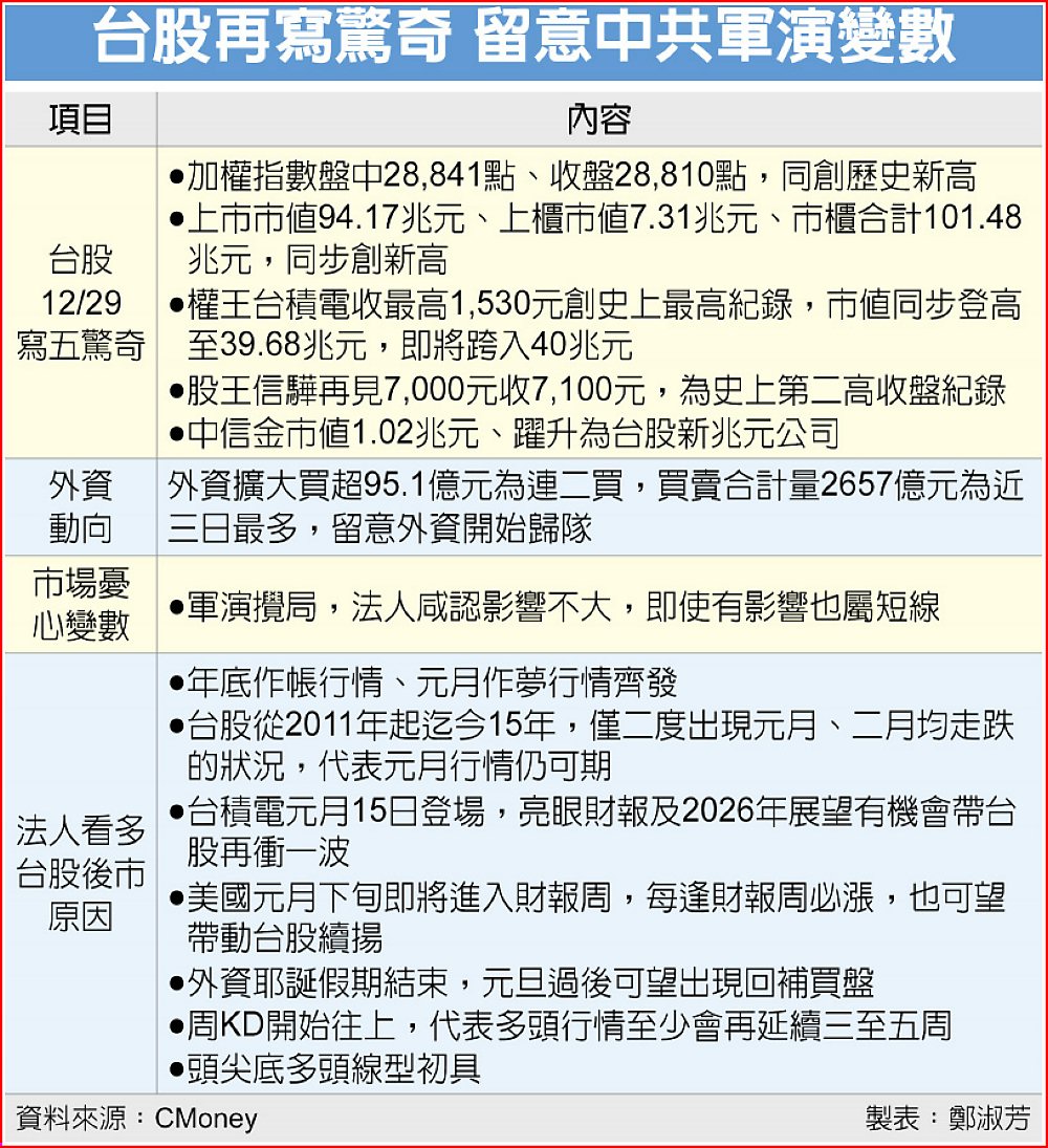 台股29日在股王信驊及權王台積電雙王帶頭衝下,再度上演五驚奇,包括加權指數盤中28,841點、收盤28,810點同創歷史新高,市櫃合計市值再攀101.48兆元新高峰,台積電寫歷史新高1,530元,股王信驊再見7,000元,中信金躍升台股新兆元公司等,2025封關收紅、2026開門喜在望。