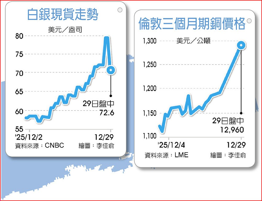 今年以來,因地緣政治風波不斷,黃金、白銀等貴金屬價格飆漲,白銀今年迄今累漲181%,表現勝過金價漲幅72%,原因包括被納入美國關鍵礦物清單、供應短缺,以及工業與投資需求同步攀升。稍早大陸官方宣布,自2026年1月1日起,白銀出口將由配額管理改為實施出口許可證制度,即須獲批准才能出口,此一新措施讓市場憂慮中國官方將收緊白銀的供應。