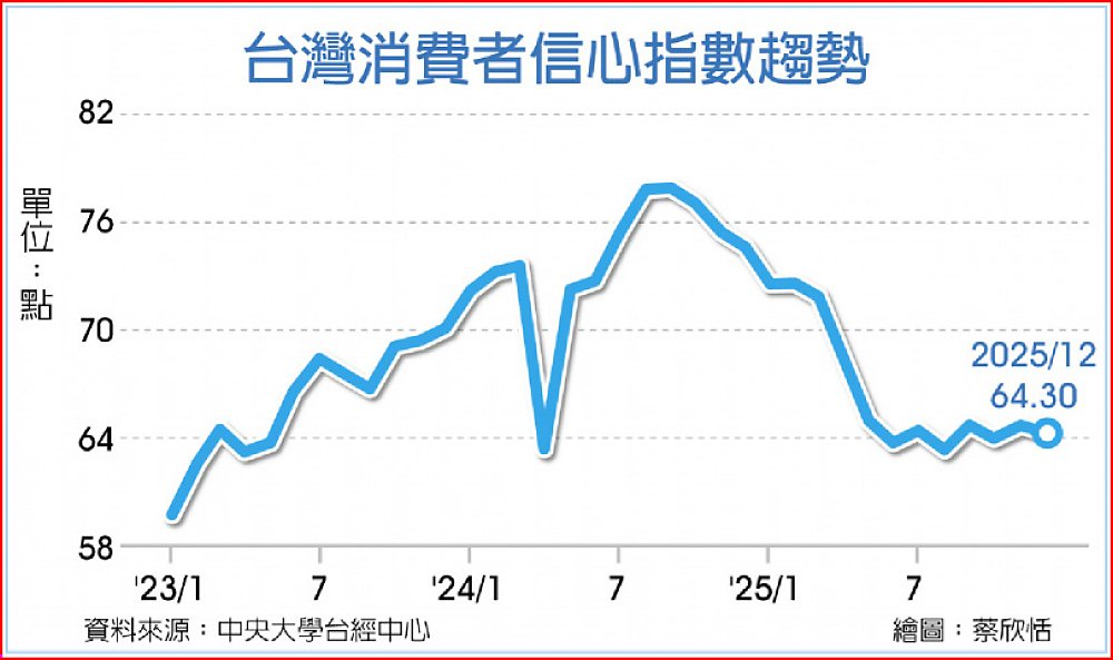 中央大學台灣經濟發展研究中心調查消費者信心指數(CCI),29日發布12月調查結果,總指數為64.3點,單月下降0.35點。中大台經中心執行長吳大任表示,12月CCI看來是由升轉弱,實際上,自今年5月以來,單月變動多不顯著,民眾的消費信心呈現膠著,研判是因為台美對等關稅、「232條款」調查還沒有最後確定,估計明年第一季情勢會更清楚,惟「CCI走向有可能大好,或大壞!」