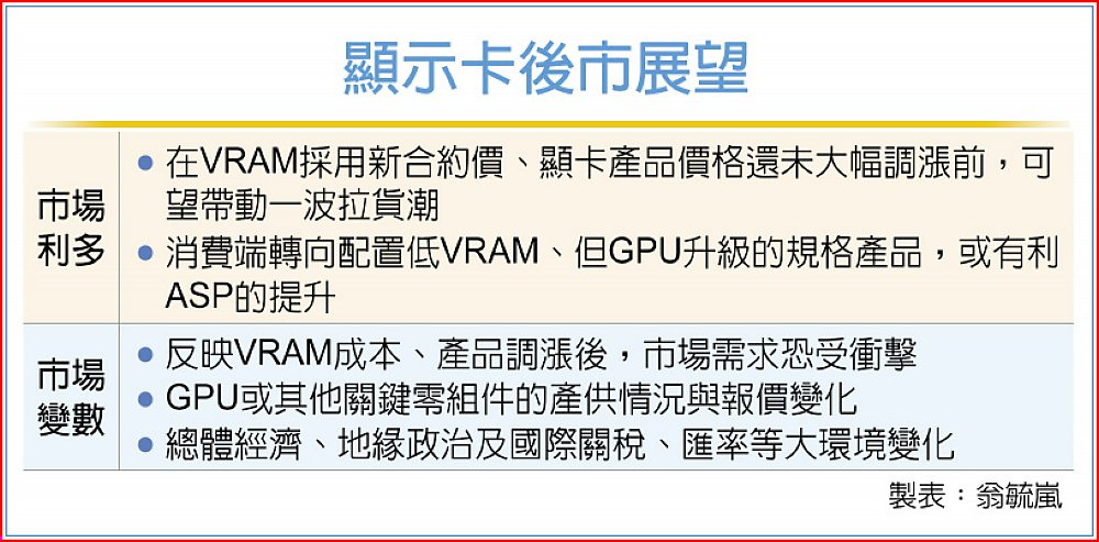 記憶體成本壓力預計自2026年首季起浮現。業者預期,3月前各品牌RTX 50系列建議售價(MSRP)將由各廠自行評估調整,但3月後輝達可能依新VRAM採購合約異動而推出新定價。此外,AMD完成中國業務團隊重整後,供應鏈業者估計其GPU顯卡業務將進一步與主機板業務整合,採取更具彈性的定價策略,在提升平均售價的同時積極擴展市占率,為未來競爭格局增添新變數。