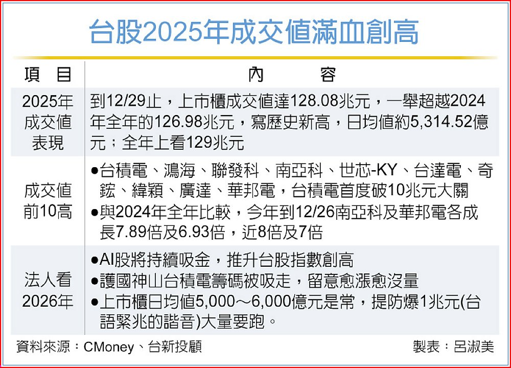 AI股大發神威強力吸金,今年至29日為止台股上市櫃總成交值飛越128兆元,完勝2024年的近127兆元、刷歷史新紀錄。法人指出,AI吸金將助攻2026年台股創高,上市櫃日均值5,000~6,000億元將成常態,但若看到1兆元就要跑。