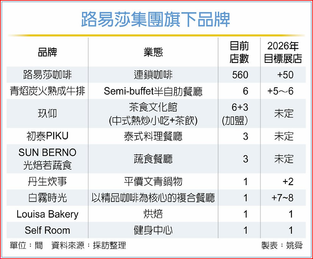 路易莎董事長黃銘賢29日表示,「白霧時光」首店插旗新北板橋新板傑仕堡,2026年目標展店7至8家;「青焰炭火熟成牛排」新增6家、「路易莎咖啡」50家,三大品牌是路易莎集團2026年展店主力。