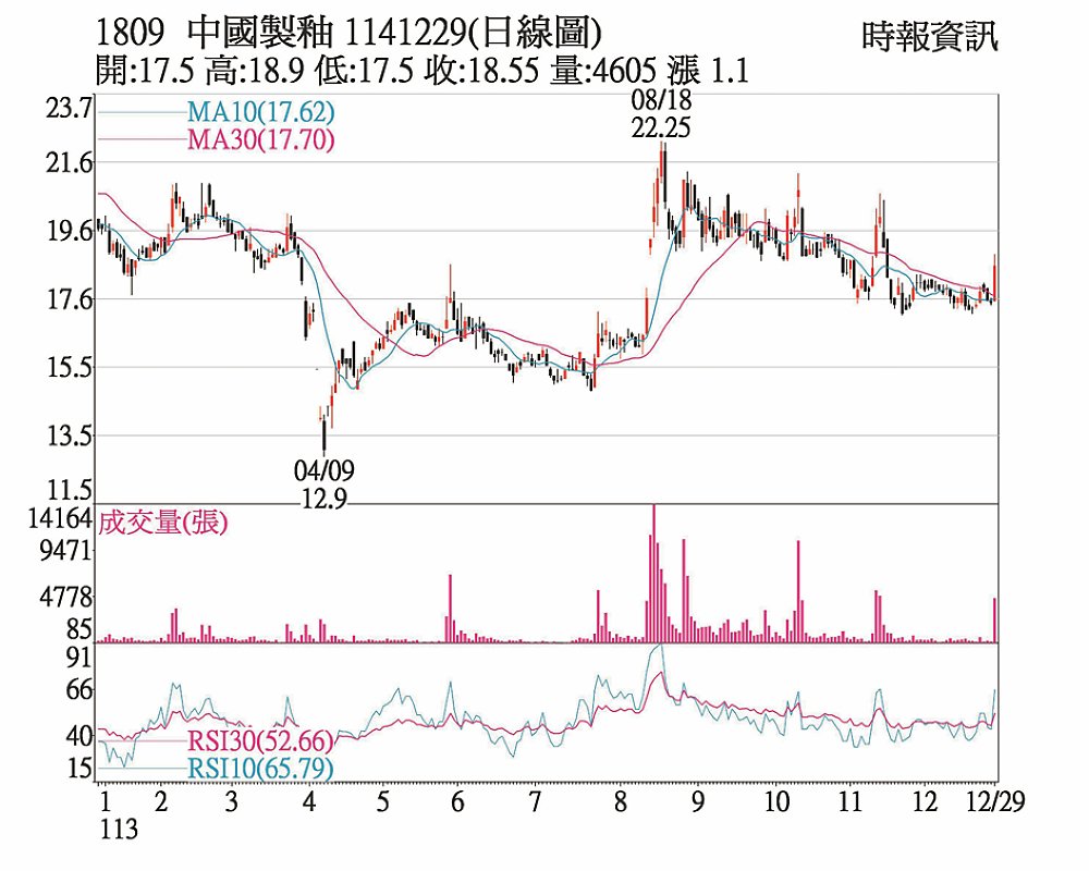 中釉(1809)打入半導體產業供應鏈,吸引法人及中長線買盤逢低承接,股價在17至18元間區間整理打底超過一個月後,29日放量突破頸線關卡,收盤18.55元,已站上所有短均線,短期的周線趨勢已反轉往上,9日KD值趨線也重新交叉走高,量能放大,市場短多動能強。唯前波19元之上短套浮額籌碼仍亂,近期若要攻堅,量能恐需維持日成交量5千張以上。