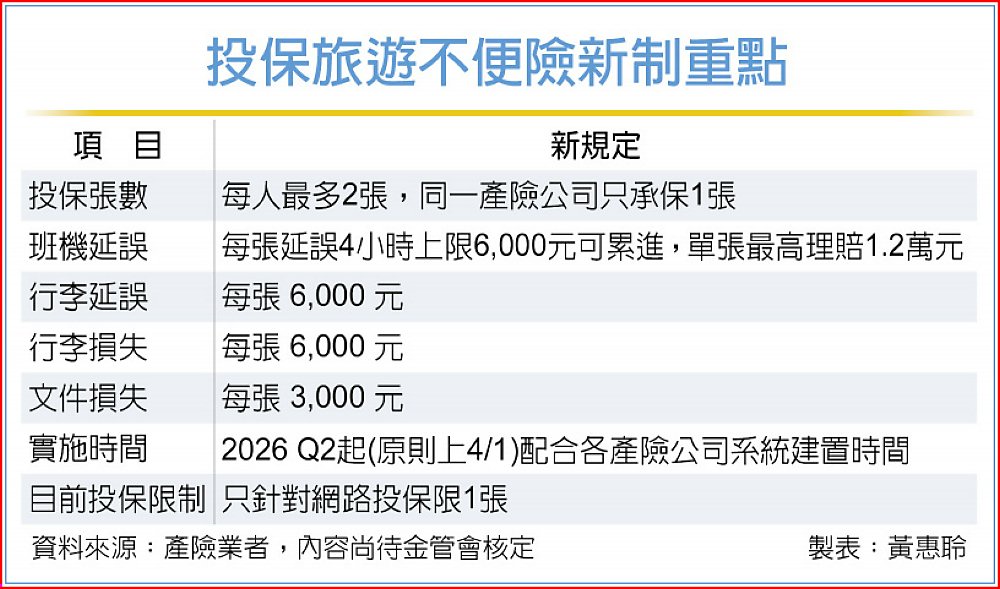 防範道德風險並回歸保險「損害填補」的基本原則,旅行不便險將自2026年第二季起針對投保張數與理賠金額進行制度化控管,產險業者表示,目前投保最多兩張、各項不便險理賠上限,目前各家產險系統也朝該方向在建置,但因相關內容尚研議通報草案報主管機關討論中,未來要等金管會核定以及各家產公司系統建置完畢之後才能確認。