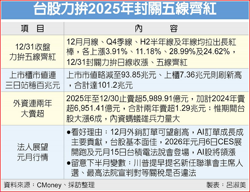 統計到30日止,12月集中市場月線、季線、半年線及年線均拉出長紅棒,分別漲3.91%、11.18%、28.99%及24.62%,外資未因台海緊張減碼,連三買共224億元、買賣交易量2,727億元為連二增,持續歸隊且偏多的外資資金有助31日封關收紅。