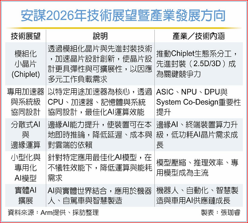 安謀認為,2026年Chiplet技術將全面普及。透過將運算、記憶體與I/O拆分為不同模組,設計團隊能針對不同製程節點進行「靈活搭配」,不僅能夠降低研發門檻,更縮短產品規模化的時間。