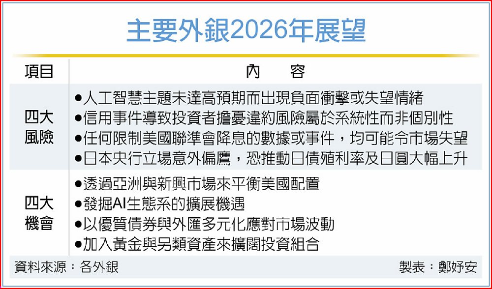 展望2026年,兩大外銀分別從風險與機會切入,勾勒新一年方向。渣打銀行從風險管理角度出發,整理出未來一年間,需留意美日央行貨幣政策的衝擊等四項風險;滙豐銀行著眼於資產配置與長期趨勢,提出四大機會,尤其強調面對市場波動,要把握結構性成長動能。