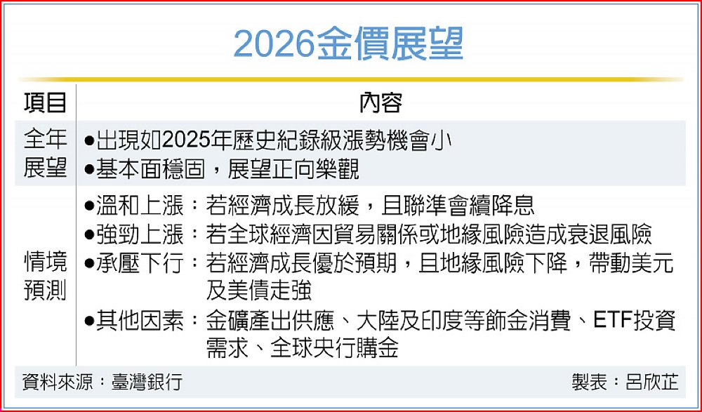 進入2026年後,臺銀分析,全球政經的多重不確定性,將持續影響黃金市場前景,若經濟成長放緩且美國聯準會(Fed)持續下調利率,金價有機會出現溫和上漲,一旦全球經濟因貿易關係緊張,或是地緣政治衝突面臨衰退風險,金價更可能迎來強勁漲勢。