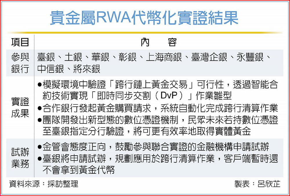 臺灣銀行主導貴金屬RWA(現實世界資產)代幣化聯合實證專案,30日完成期末成果報告,與會人士透露,金管會對於驗證結果態度正向,鼓勵參與聯合實證的金融機構申請業務試辦。