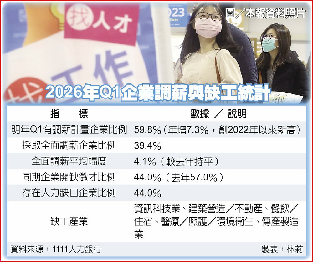 年關將近,國內企業啟動年度體檢,並布局2026年度人力徵才。1111人力銀行30日發布調查顯示,2026年第一季企業徵才意願明顯降溫,惟調薪意願創近四年新高。1111人力銀行發言人曾仲葳指出,企業對新增人力持審慎態度,偏好透過調薪、獎金與福利留住核心員工,以降低招募與訓練成本。