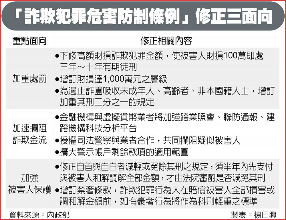 對於修法重點加重處罰方面,下修高額詐欺的門檻從500萬元降至100萬元,被害人財損達100萬元即處三年以上,十年以下有期徒刑。