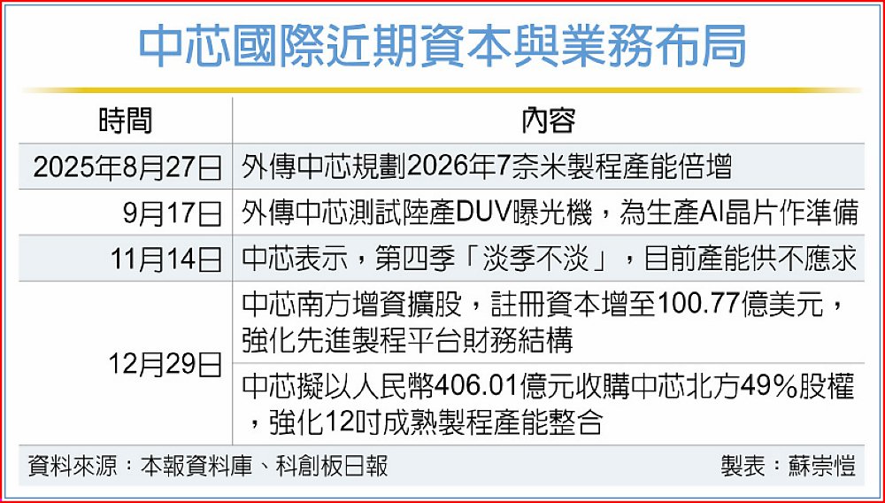 在鞏固成熟製程之際,中芯國際同步注資先進製程主體「中芯南方」。中芯國際29日公告,將引入大基金三期、先導集成電路基金等作為新投資方,使中芯南方的註冊資本從65億美元,增至100.77億美元。目的在於降低中芯南方的資產負債率,並建構中芯國際更穩健的財務結構。