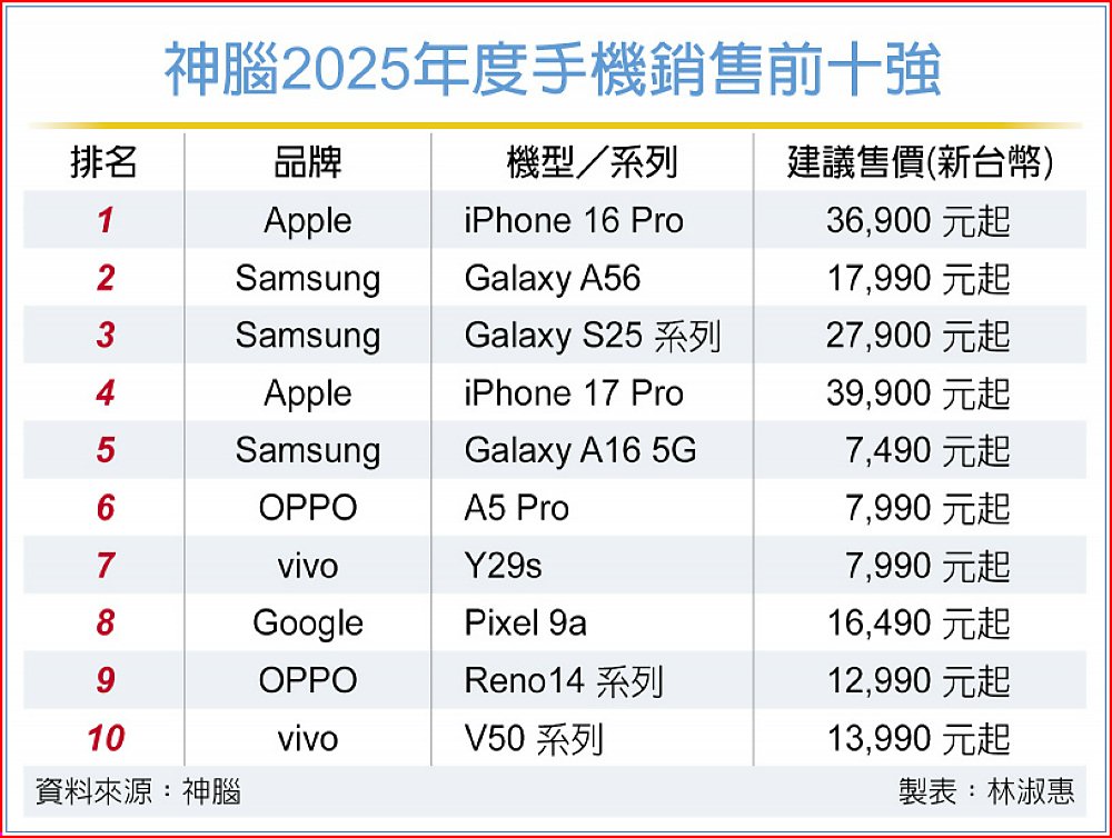 國內最大通訊通路代理商神腦30日揭曉2025年度前十名暢銷手機,中階AI手機躍升成為市場主力,Google Pixel手機年增近6成,成為最大黑馬。