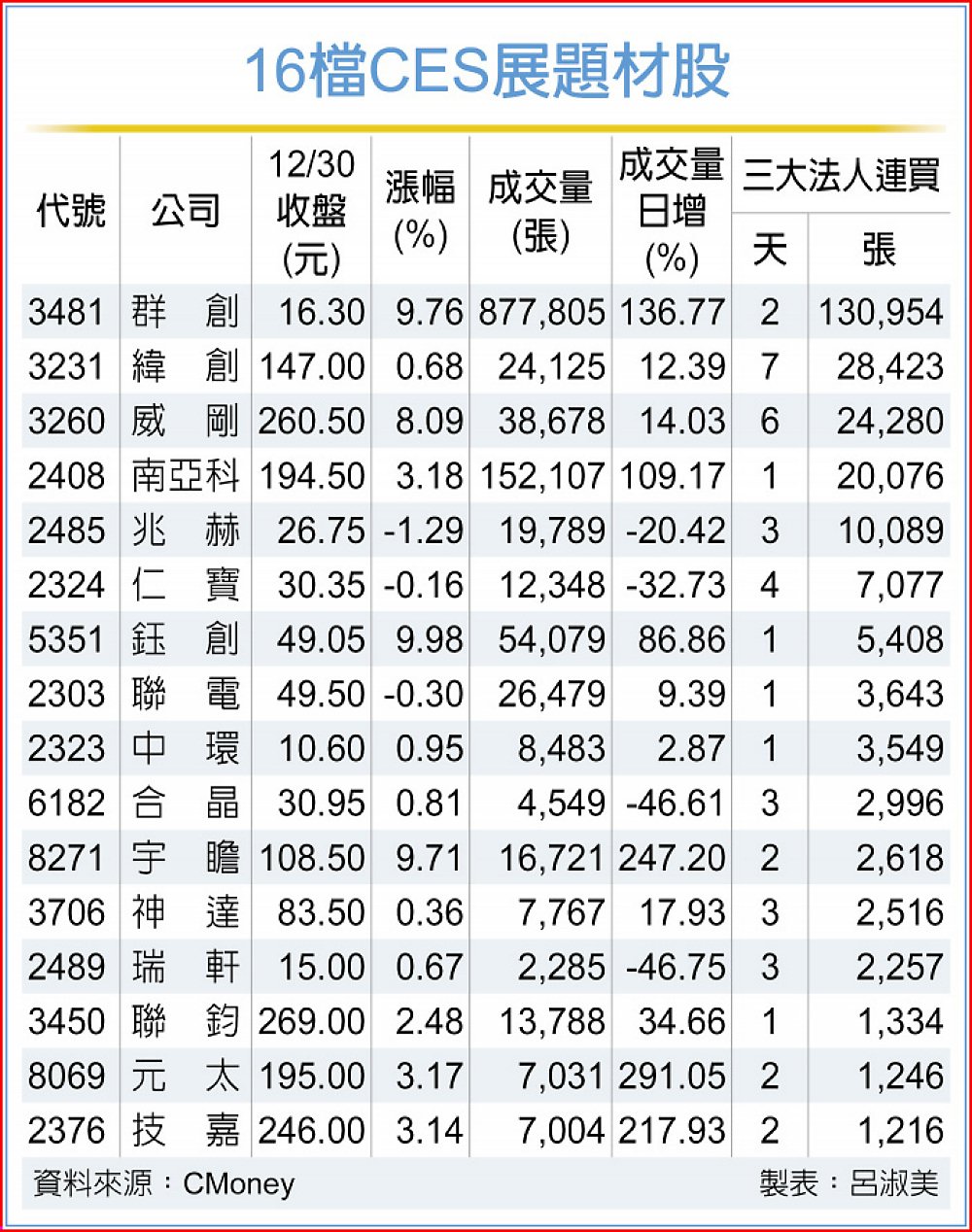 台股中有群創、緯創、威剛、南亞科、兆赫、仁寶、鈺創、聯電、中環、合晶、宇瞻、神達、瑞軒、聯鈞、元太及技嘉等16檔CES概念股,30日成市場焦點,三大法人買盤大舉湧入,不是轉為買超就是連續敲進買超。