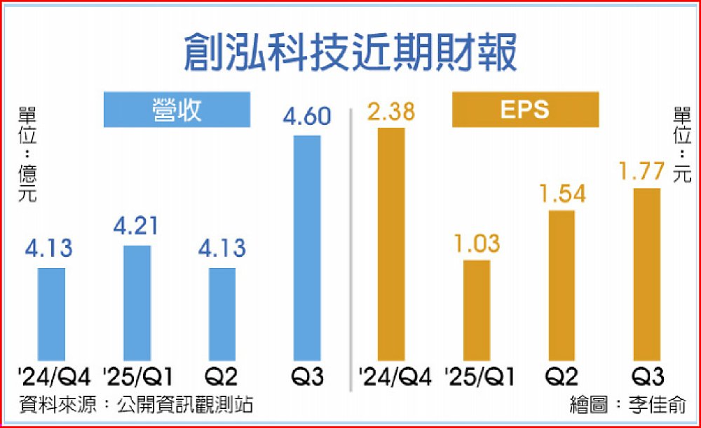 創泓科技前11月累計營收16.05億元,年增55.6%,前三季每股稅後純益4.34元,優於2024年同期的2.69元。