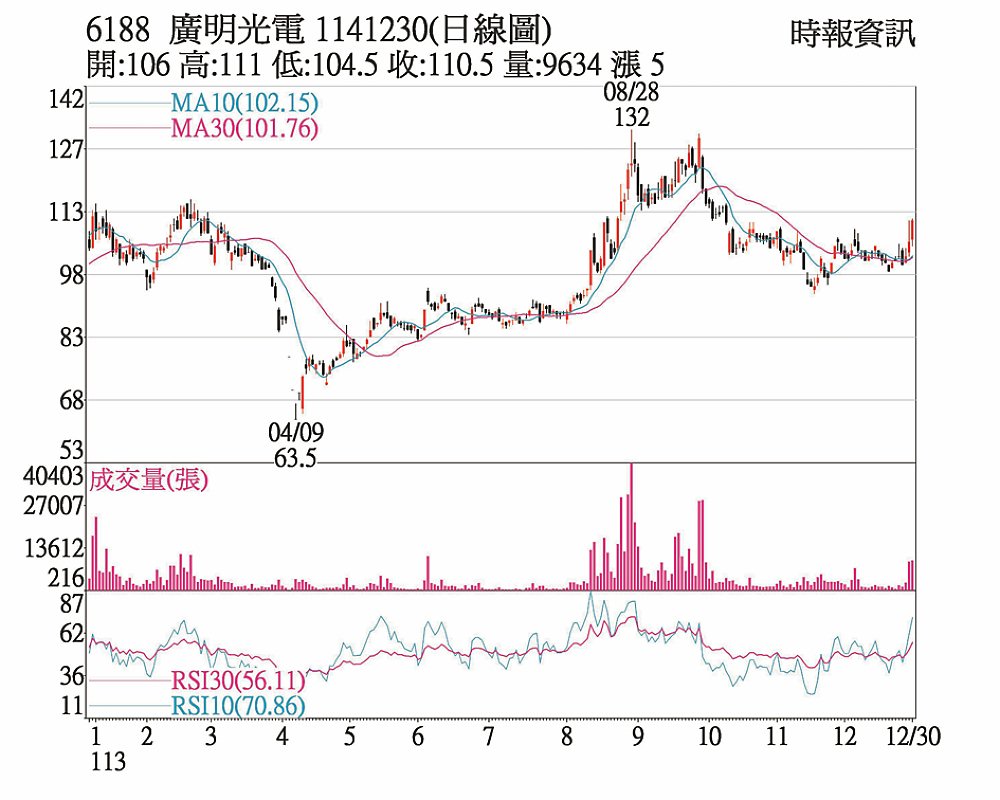 廣明(6188)受惠於美國消費性電子CES即將開展,連兩日價量俱揚,30日以106元開盤,單日上漲5元,漲幅4.74%,終場以110.5元作收,投信連三日加碼,累計買超逾4千張。