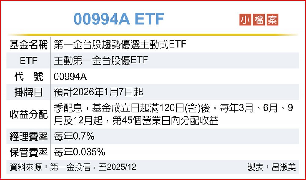 主動第一金台股優(00994A)ETF已在12月26日成立,預計將在2026年1月7日起正式於交易所上市掛牌交易,成為2026年第一檔掛牌的台股主動式ETF,可望全力衝刺金馬年行情。